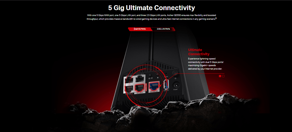 - Flexible Network Port Configurations: With 1× 5 Gbps WAN port, 1× 5 Gbps LAN port, and 3× 2.5 Gbps LAN ports, Archer GE550 ensures ultimate flexibility and maximum throughput. These configurations support massive bandwidth for wired gaming devices and ultra-fast connections, accommodating all gaming needs.§