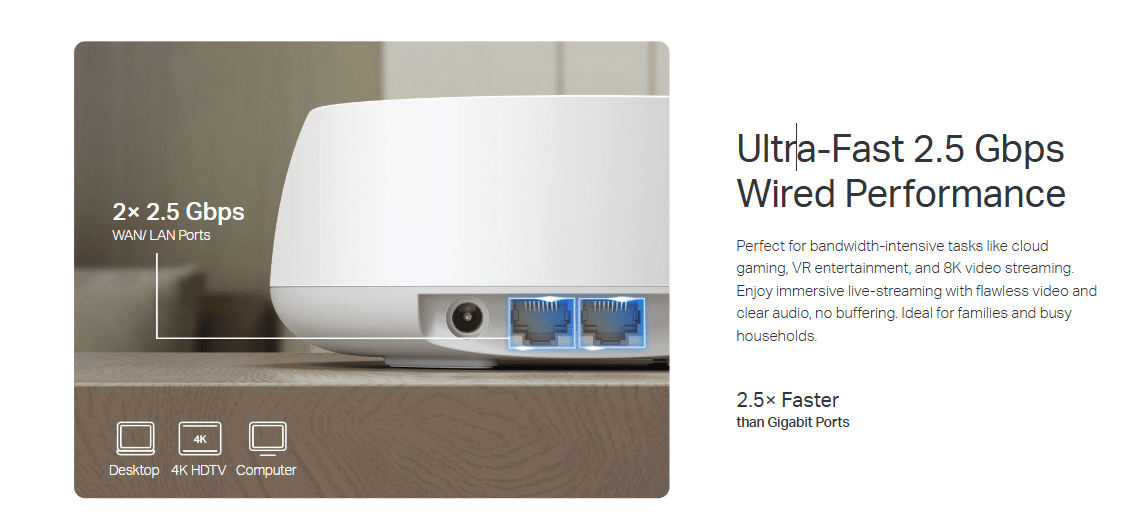 - 2.5 Gbps Wired Connections – 2× 2.5 Gbps ports ensure max flexibility and boosted throughput.§